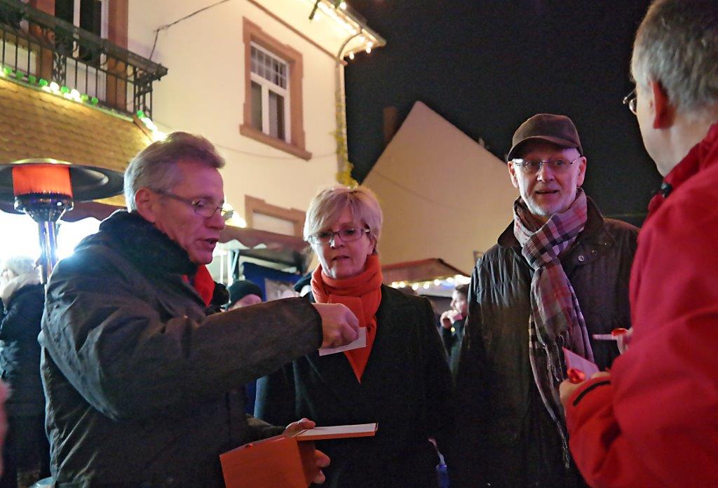 Am Freitagabend in Lorsch, wo die Genossen Frank Schierk, Stadträtin Angela Velten, Hans Jürgen Sander, Stefan Link Iris und mich beim Gang über den malerischen Weihnachtsmarkt zwischen dem Fachwerk des alten Rathauses und der karolingischen Königshalle begleiten. Ich verteile rote Schokoherzen, die auf einem Kärtchen kleben. Der Landratskandidat mit Herz wirbt darauf für die Wahl am 22. März 2015. Kommt ausgesprochen gut an, und ich treffe kurz vor der feierlichen Eröffnung des Marktes Bürgermeister Christian Schönung und spreche auch mit dem neuen CDU-Fraktionschef Alexander Löffelholz und seinem Stellvertreter Olaf Jünge.